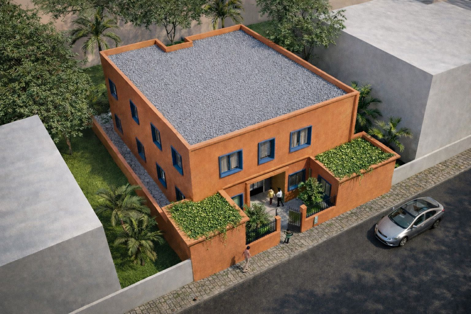 L’écriture du projet repose sur une géométrie contemporaine, claire et structurée, mise au service d’une architecture ancrée dans son contexte. Les matières, les teintes et les proportions font écho aux codes vernaculaires, non pas dans une logique de reproduction, mais de transposition.